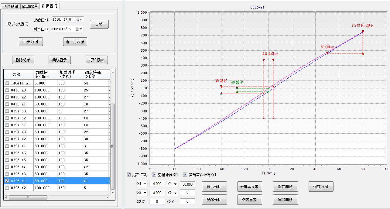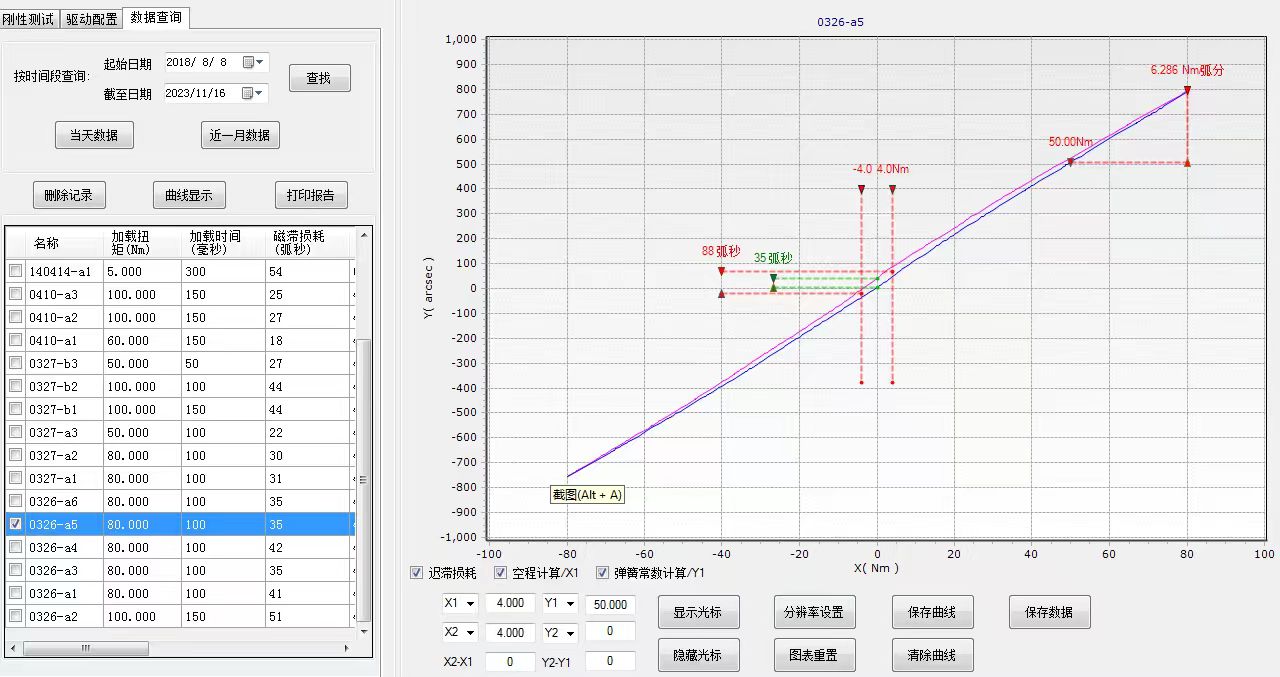 扭轉剛度測試時,滯回曲線上扭矩±3%時的轉角值差,與剛度、空程綜合輸出評定結果并繪制滯回曲線。